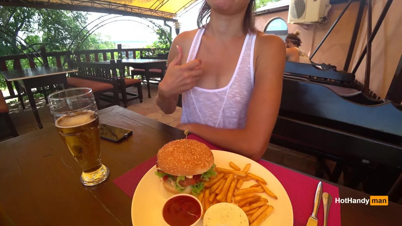 Кушает бургер и светит сиськами в кафе в прозрачной майке без лифчика (Трейлер)