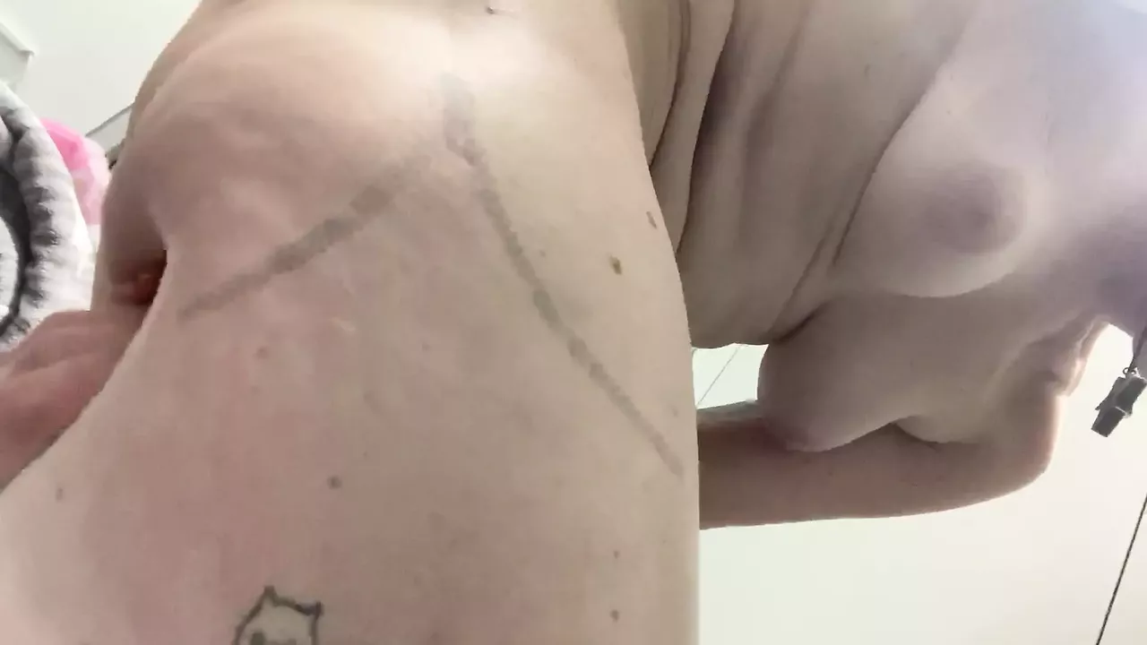 Naked at Heathrow and massaging my scarred thigh and ass because cancer in the mid 90's has left it ruined